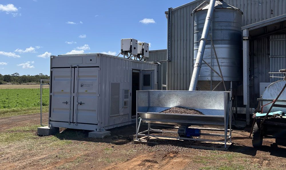 Clean Firm Power installed a world first macadamia shell plus solar powered microgrid to provide electricity for the processing system and heat for drying macadamias.